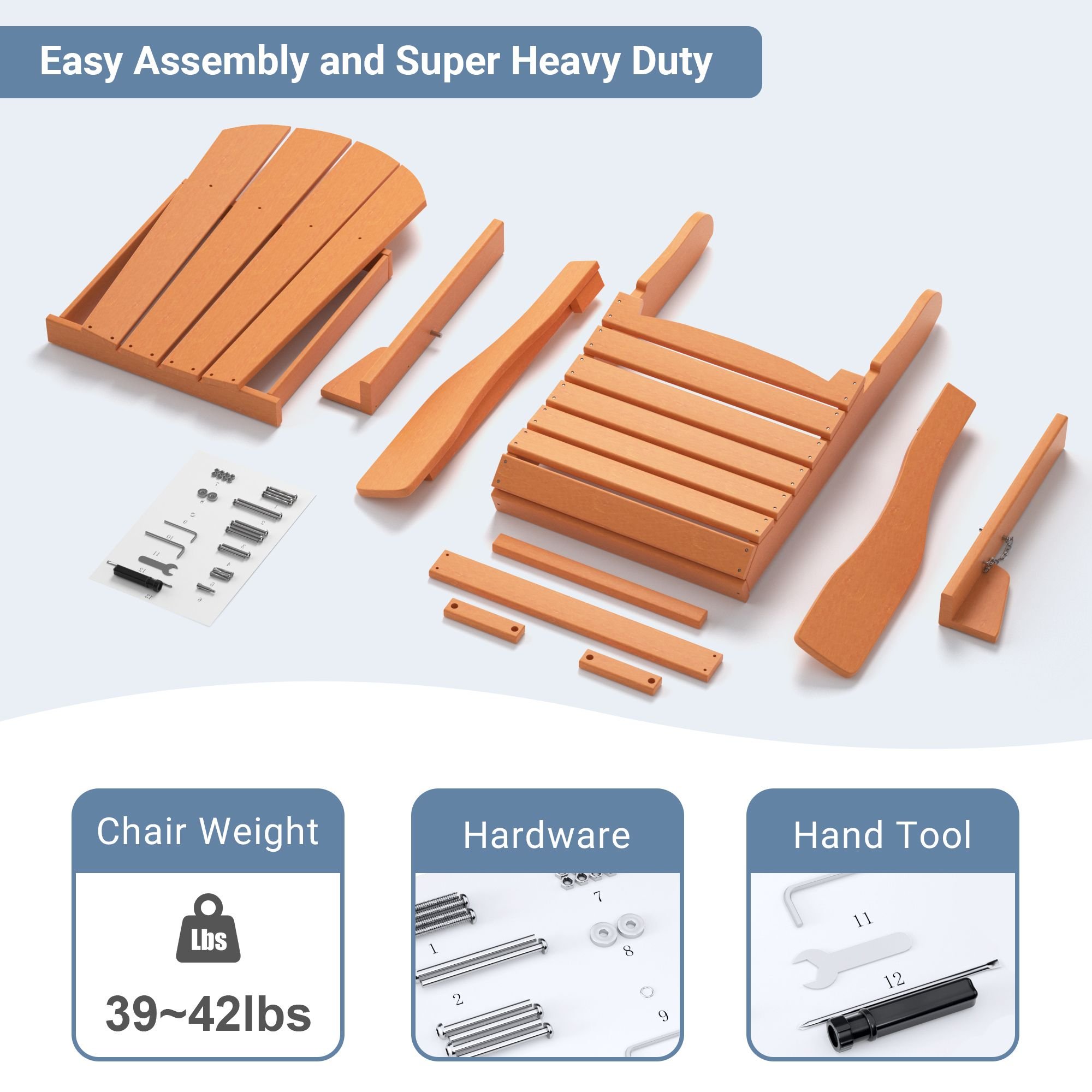 5.5.[Tools Included and Easy Assembly] This Adirondack chair’s assembly is super easy with all the tools and hardware included. If you have a power drill, to use the drill will speed up the process. If you don’t have one, to use the hand tool included will be nice. One person can do put them together.