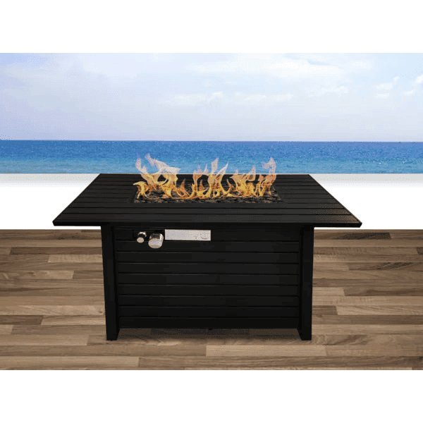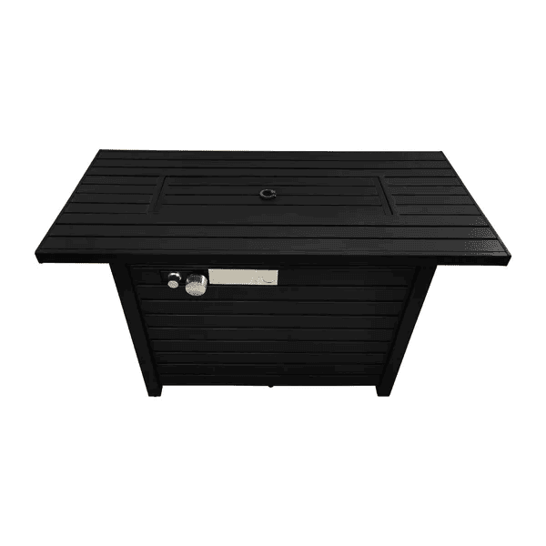 Turn any chilly evening into a cozy gathering with this modern fire pit table. Crafted with a steel base, this table features a neutral finish that resists rust and weather, so it's ready for use on your patio or deck. We love the stainless steel top and included lava rocks that add a contemporary look, while a side door opens for easy access to your propane tank or natural gas (sold separately) and a control panel that has integrated ignition. This fire pit table comes with a protective cover, and it's safe for use on a wood deck.