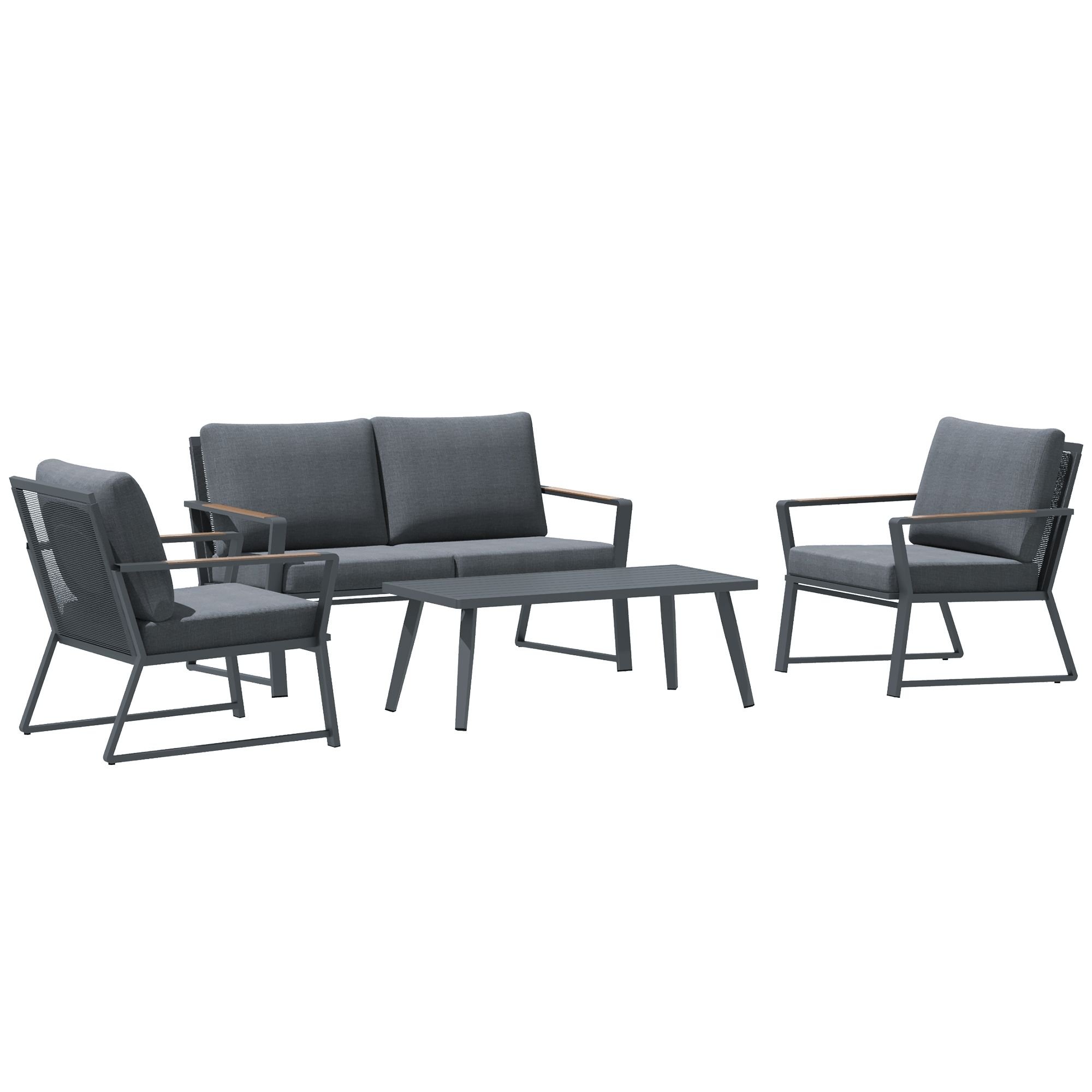 4 Piece Patio Furniture Set, Aluminum Conversation Set, Outdoor Garden Sofa Set with Armchairs, Loveseat, Center Coffee Table and Cushions, Dark Grey 4 Piece Patio Furniture Set, Aluminum Conversation Set, Outdoor Garden Sofa Set with Armchairs, Loveseat, Center Coffee Table and Cushions, Dark Grey 4 Piece Patio Furniture Set, Aluminum Conversation Set, Outdoor Garden Sofa Set with Armchairs, Loveseat, Center Coffee Table and Cushions, Dark Grey