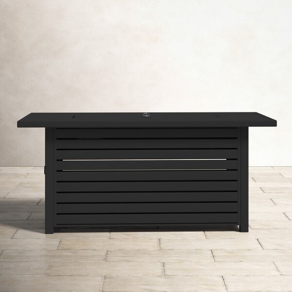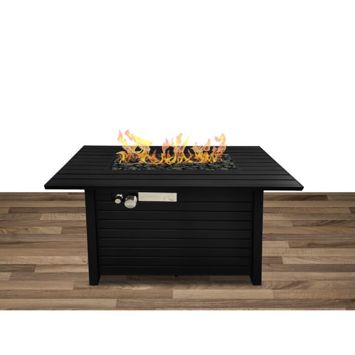 Add this outdoor fire pit table to your patio or backyard and make some memories. Designed to stand up to the elements, this weather-resistant 54" W fire pit table is made of steel in a black finish. The fire bowl is set into a table, so your guests have room to place their drinks. Best of all, you can adjust the fire's flames. This fire pit takes natural gas and features a hidden fuel tank for a clean-lined look. Plus, the lava rocks, fire bowl lid, and protective cover are all included.