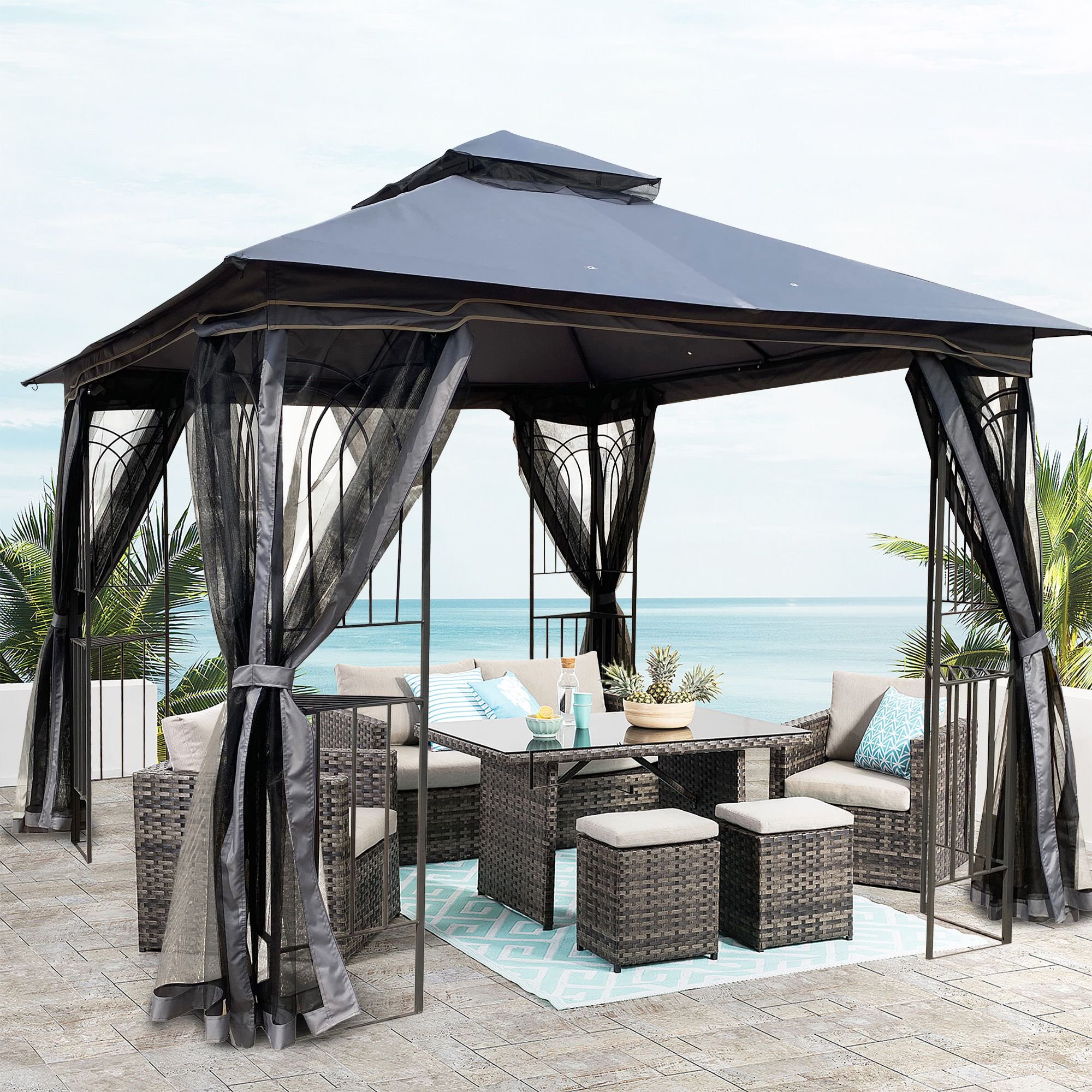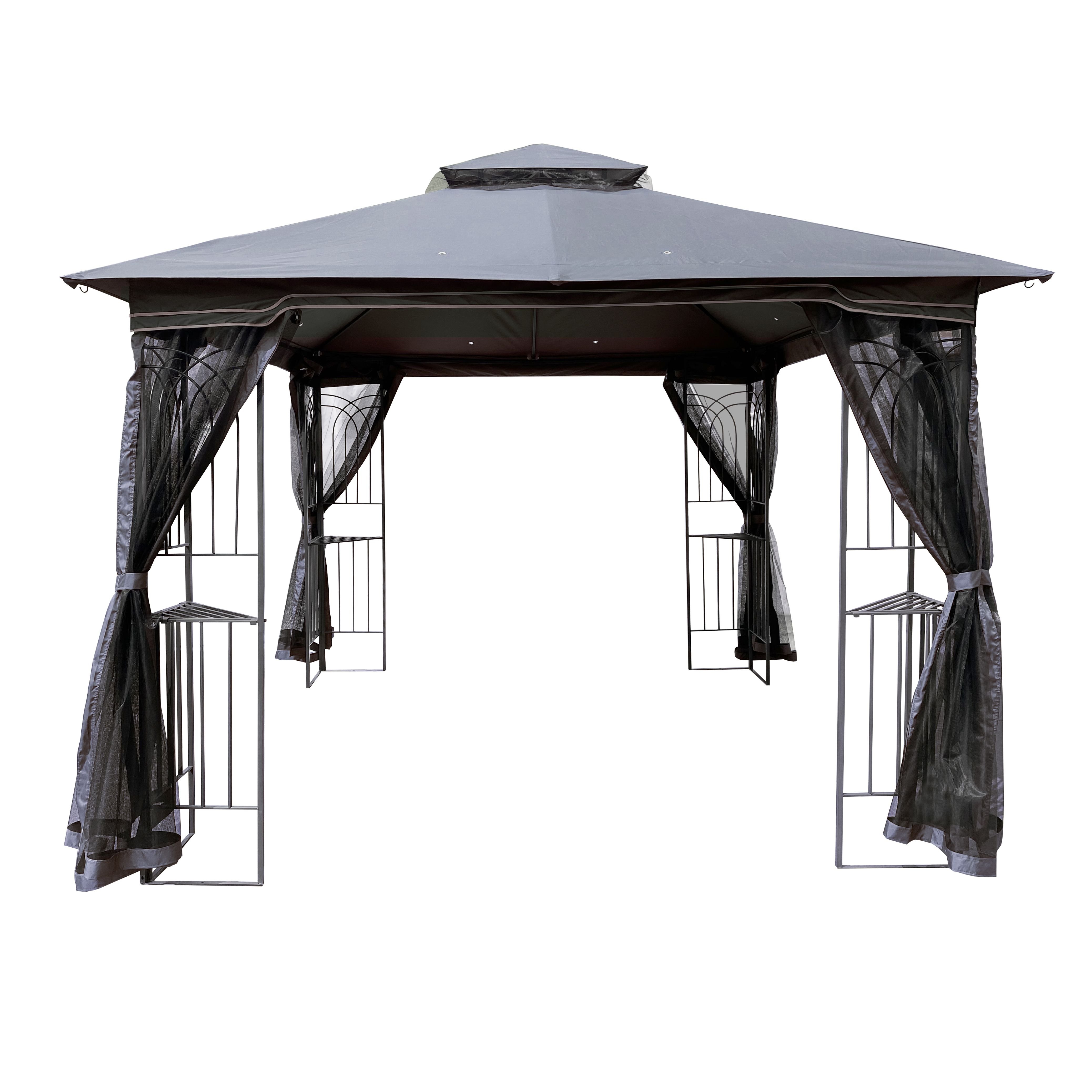 Roof Color: Gray Product Type: Gazebo Frame Material: Steel Frame Finish Color: Black Powder Coated Frame Finish: Yes Soft Roof: Yes Roof Material: Polyester Tiered Roof: Yes; Double Tier Roof Snow Load Capacity: 10 Pounds Roof Hanging Weight Capacity: 5 Pounds Portable: No Storage Bag Included: No Rust Resistant;Weather Resistant;Water Resistant: Yes Pieces Included: 1xGazebo(Contains tools and accessories);1xInstallation Mesh Screens (Mosquito Net)Included: Yes; 4 sides Adjustable Height: No Supplier Intended and Approved Use: Residential Use Compatible Installation Surfaces: All Surface Types Country of Origin: Made in China About Assembly Installation Required: Yes Level of Assembly: Full Assembly Needed Adult Assembly Required: Yes Suggested Number of People: 2 Assembly Instructions Included: Yes